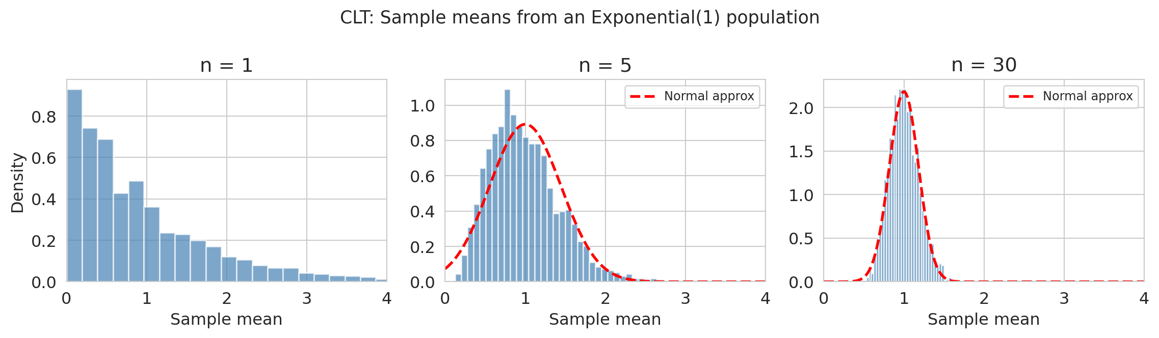 The population here is Exponential(1) — visibly skewed. But by $n = 30$, the distribution of sample means is nearly bell-shaped. The CLT explains why the normal distribution shows up everywhere in Chapters 8--12, even when the underlying data aren't normal: we're usually looking at *averages* (or functions of averages), and the CLT guarantees those are approximately normal.