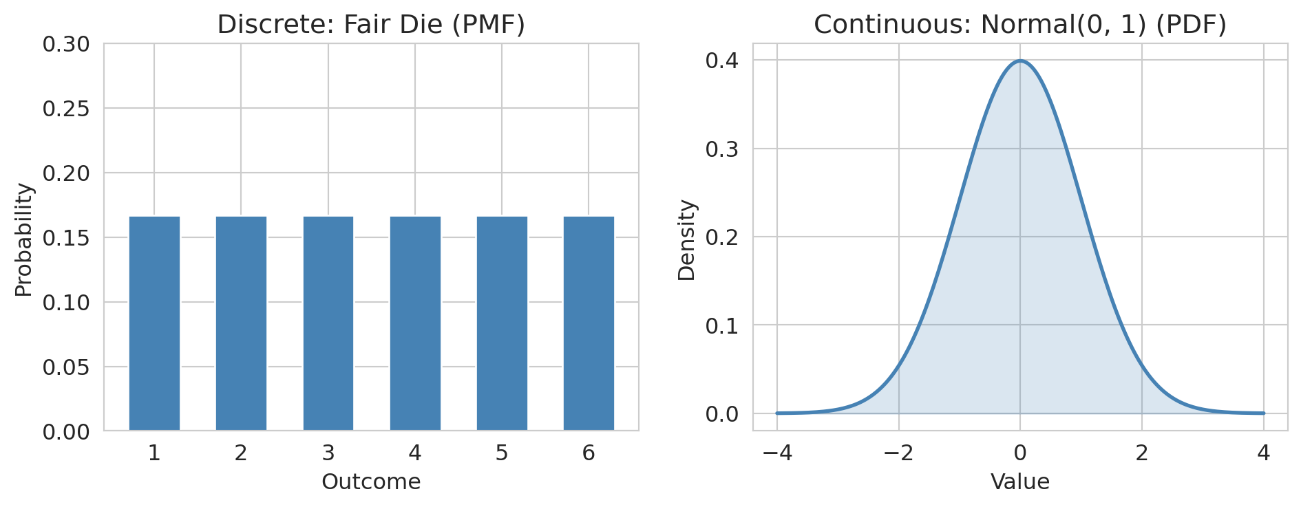 The distinction matters for how we assign probabilities: discrete random variables have **probability mass functions** (PMFs) while continuous ones have **probability density functions** (PDFs). The intuition is the same — both tell you which values are more or less likely.