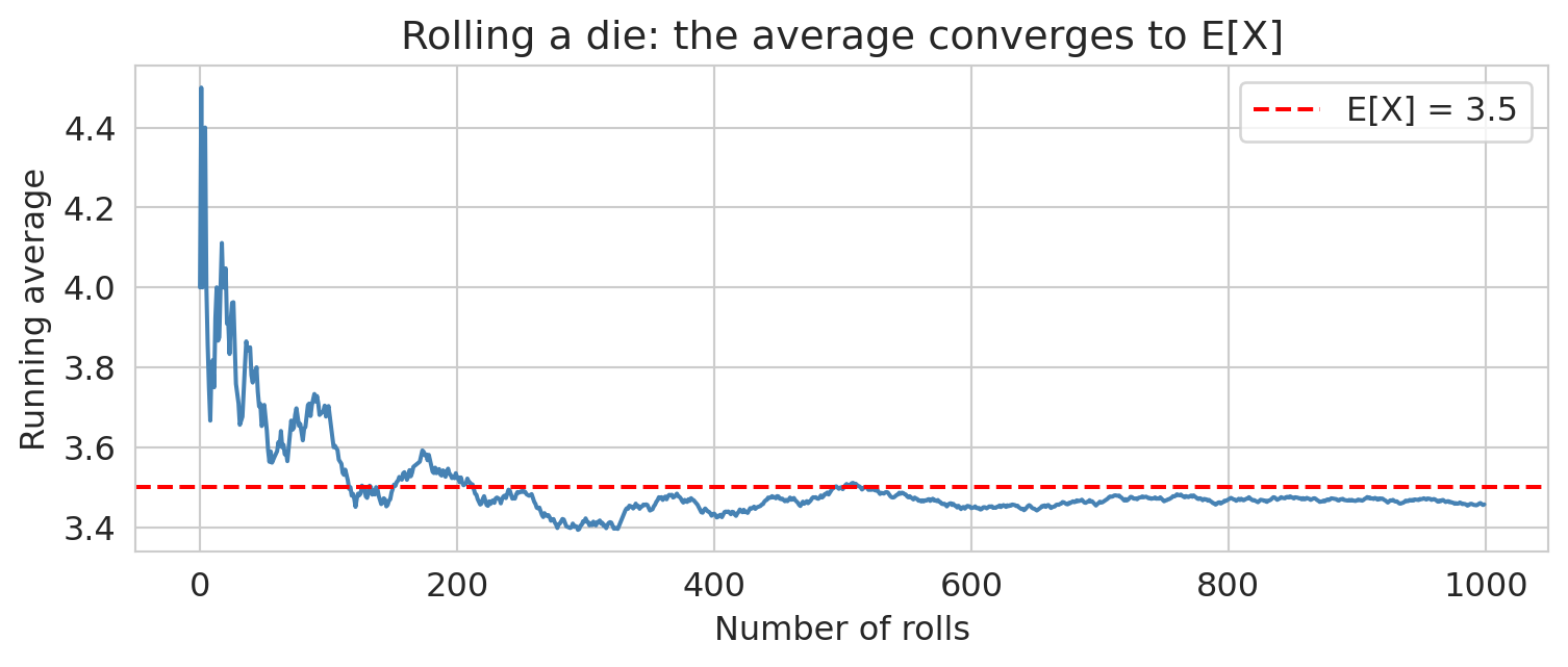 The LLN provides the formal justification for something intuitive: flip a coin enough times and the fraction of heads approaches 0.5. It's also why bigger samples give more reliable estimates — the running average plot in the Expected Value section illustrates LLN in action.