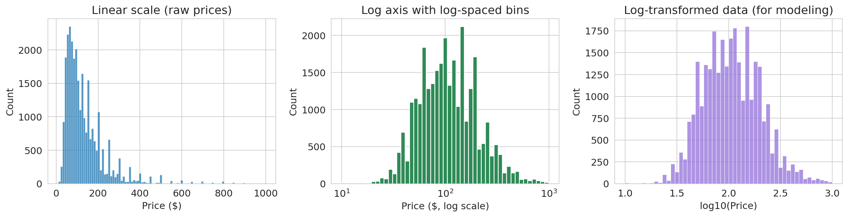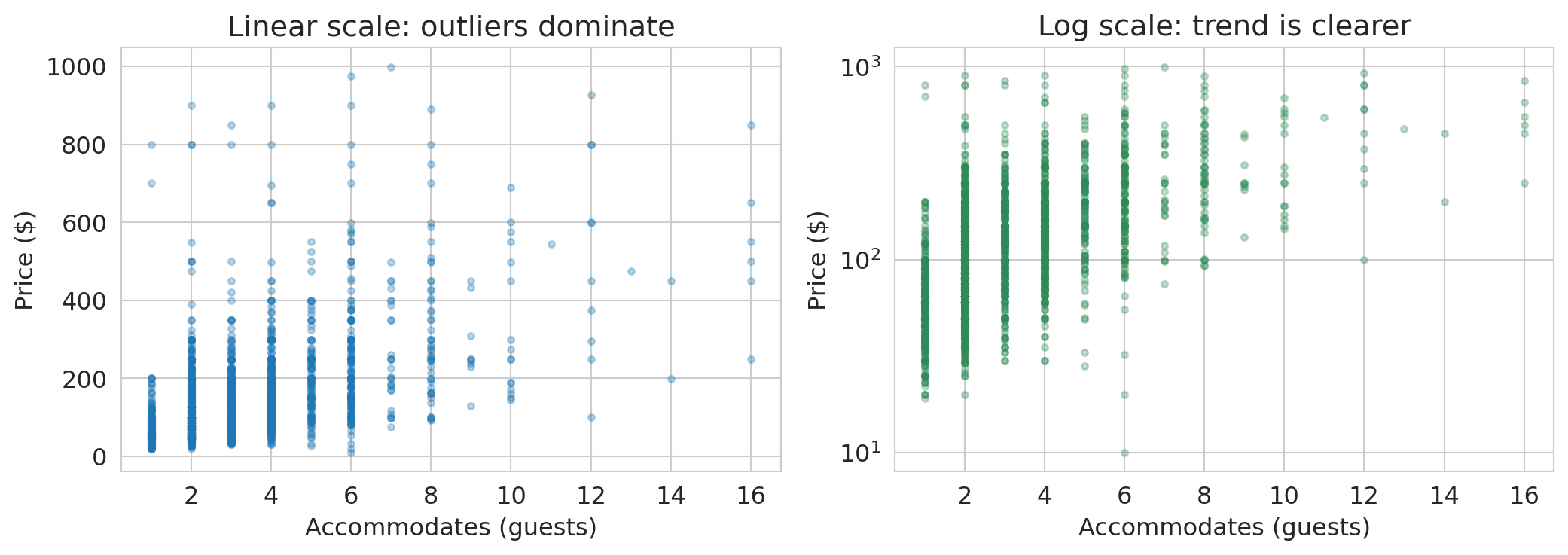 The left plot wastes space — the distribution is so skewed that most data piles up on the left. A long tail of expensive listings dominates the scale.