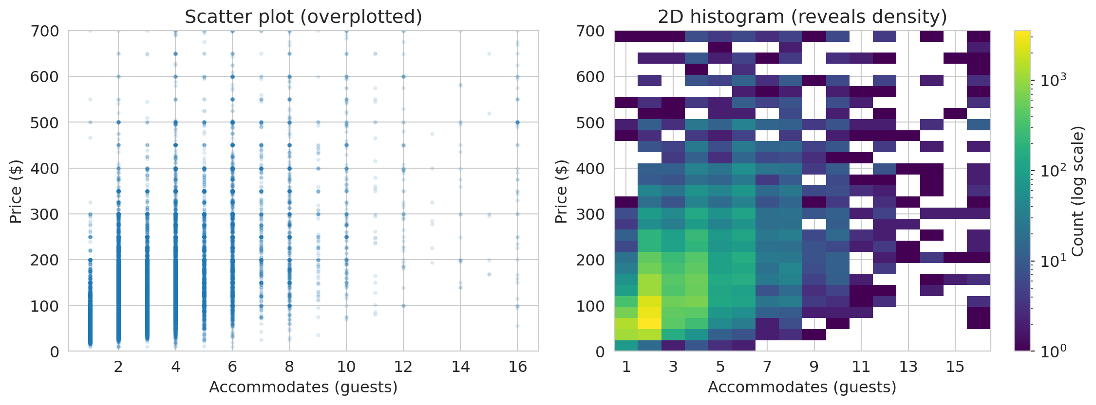 | Two numeric (dense) | 2D histogram / heatmap | Relationships (large n) |