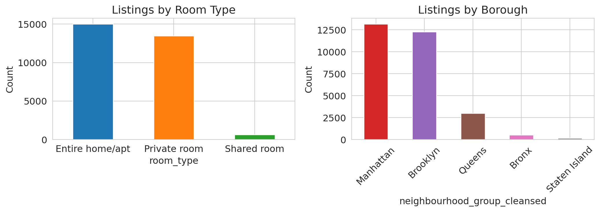 The overall gap exceeds every room-type-specific gap. Part of what looked like a "Manhattan premium" was actually a **composition effect**: Manhattan has a higher proportion of entire homes (the most expensive room type), which pulls up its overall median. When we compare like with like — entire homes to entire homes, private rooms to private rooms — the borough difference shrinks.