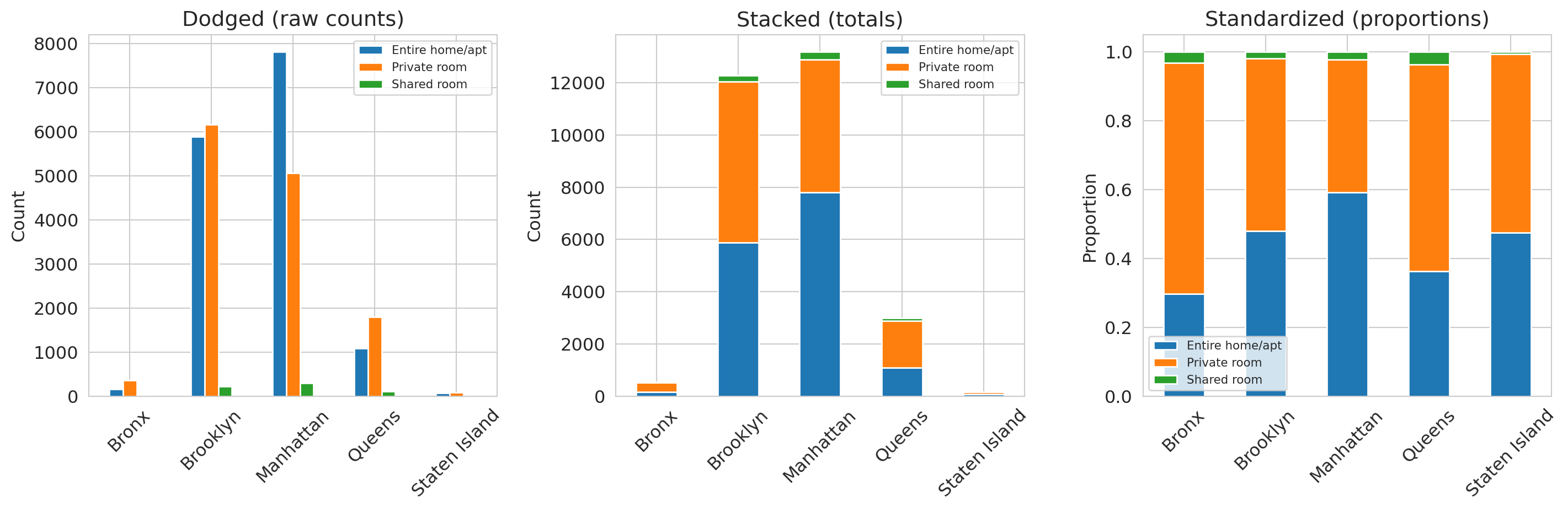 | Two categorical | Stacked/dodged/standardized bar | Compare composition across groups |
