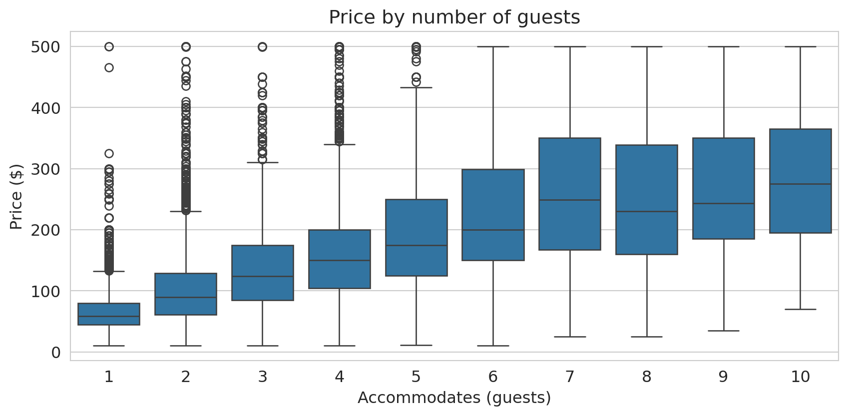 The median price roughly doubles from 1-guest to 6-guest listings. The boxes also show that spread increases with group size — larger listings have more price variability.
