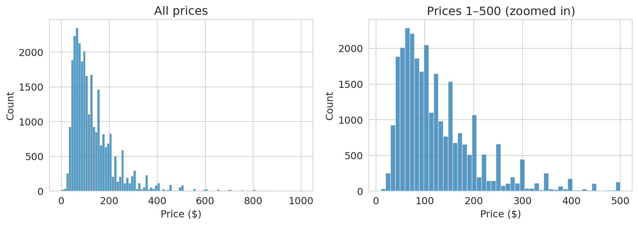 The zoomed-in version on the right is more informative. Most listings fall between \$50 and \$200/night, with a peak around \$100.