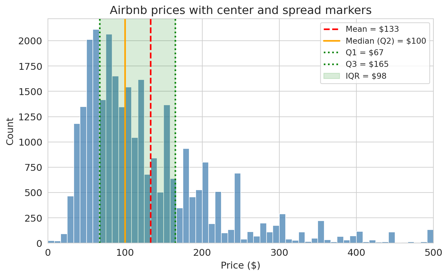 The mean is noticeably higher than the median. A few hundred expensive listings pull the average up. If you're an Airbnb host pricing a typical apartment, the mean is misleading — the median better represents a typical listing.