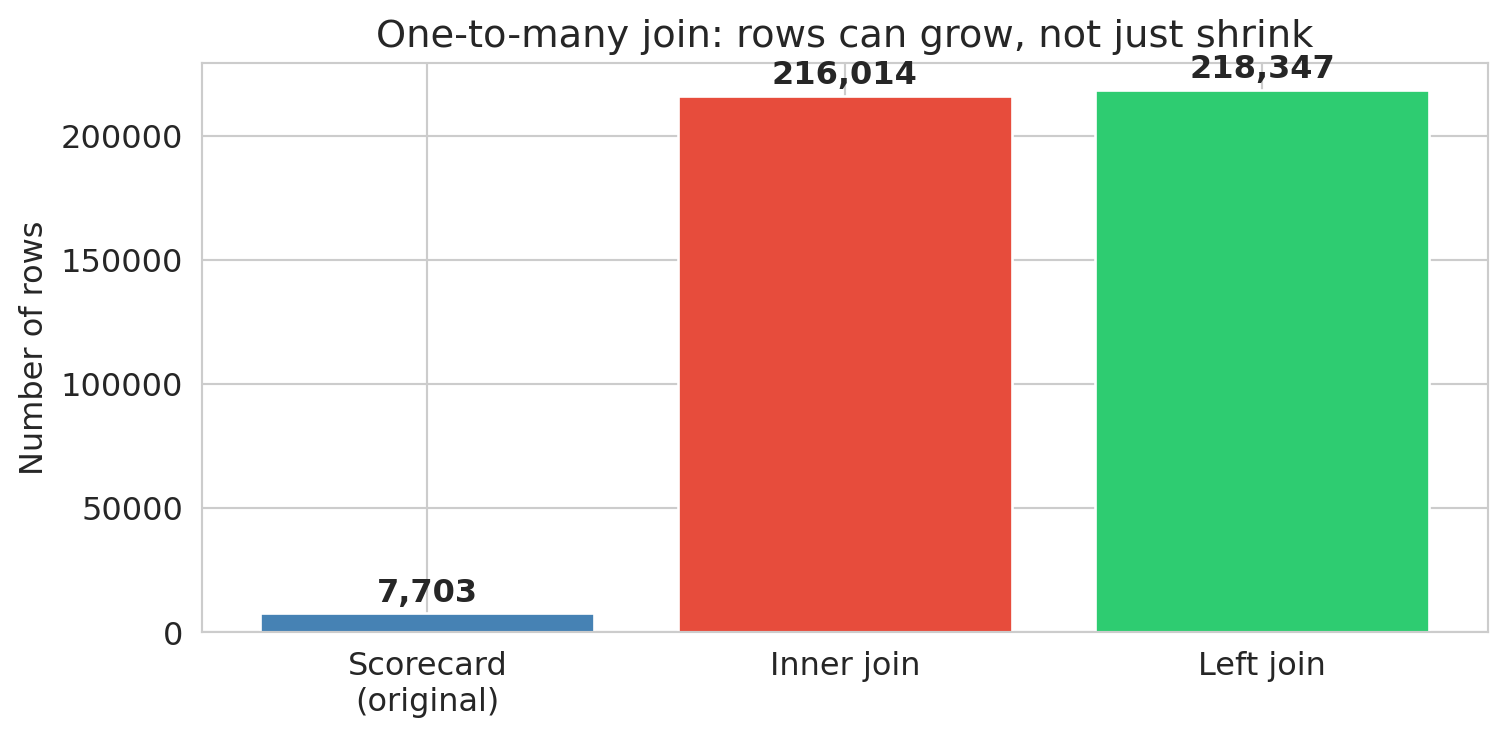 - **One-to-many join** — when one key in the left table matches multiple rows in the right table, the output has more rows than either input. Always check row counts after joining.