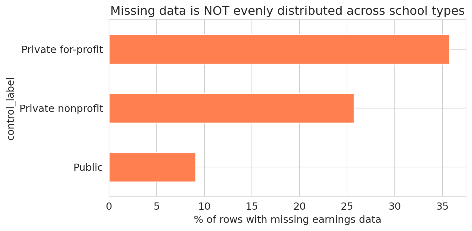 The distribution shifts dramatically. For-profit schools and certificate programs — which rarely report SAT scores — nearly vanish. The result is **selection bias**: dropping rows with missing data changes *which* schools remain in the sample, and the AI proceeds with the "cleaned" data as if nothing happened.