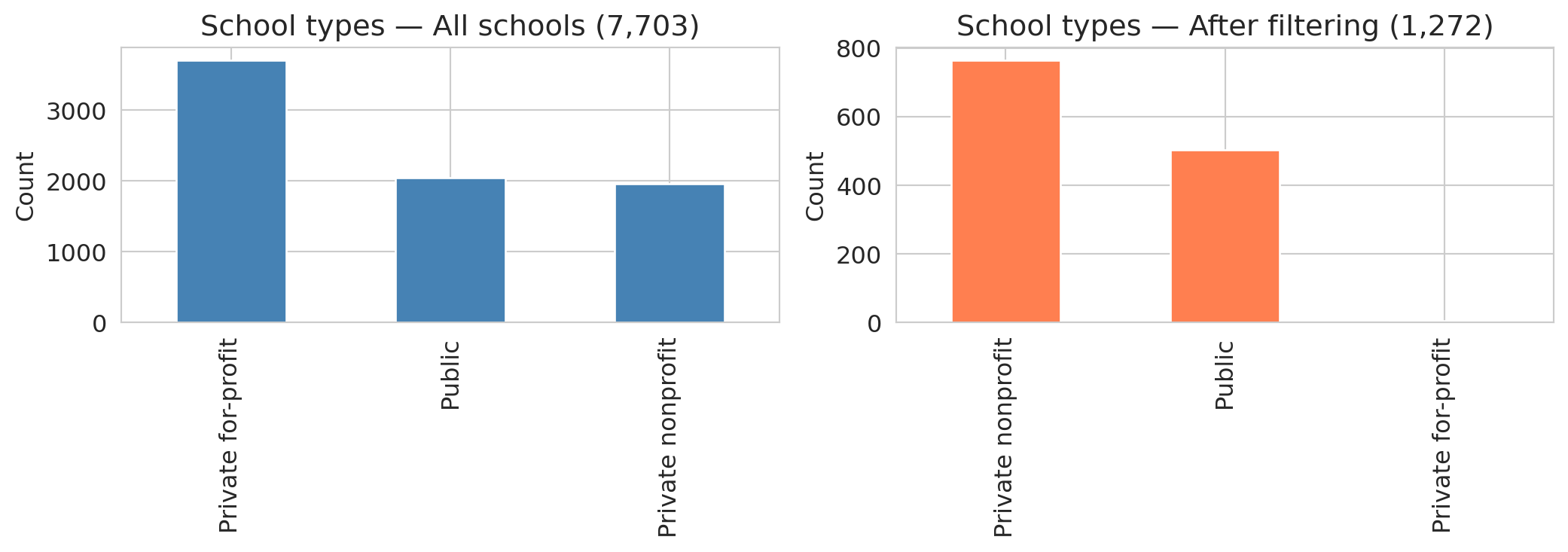 axes[1].set_title(f'School types — After filtering ({len(sc_partial):,})')