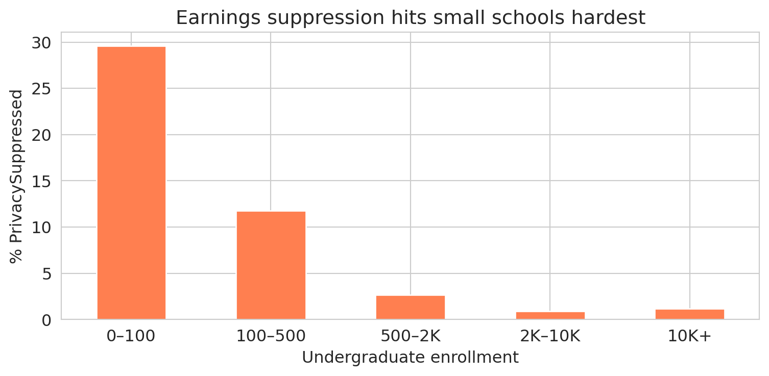 Nearly a third of the smallest schools have suppressed earnings data. Among schools with 2,000+ students, the rate drops to about 1%. The suppression isn't random — it targets small cohorts, and small cohorts come from small schools.