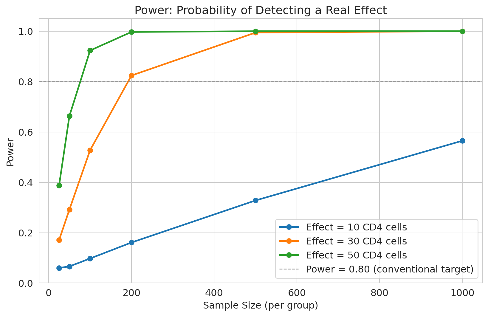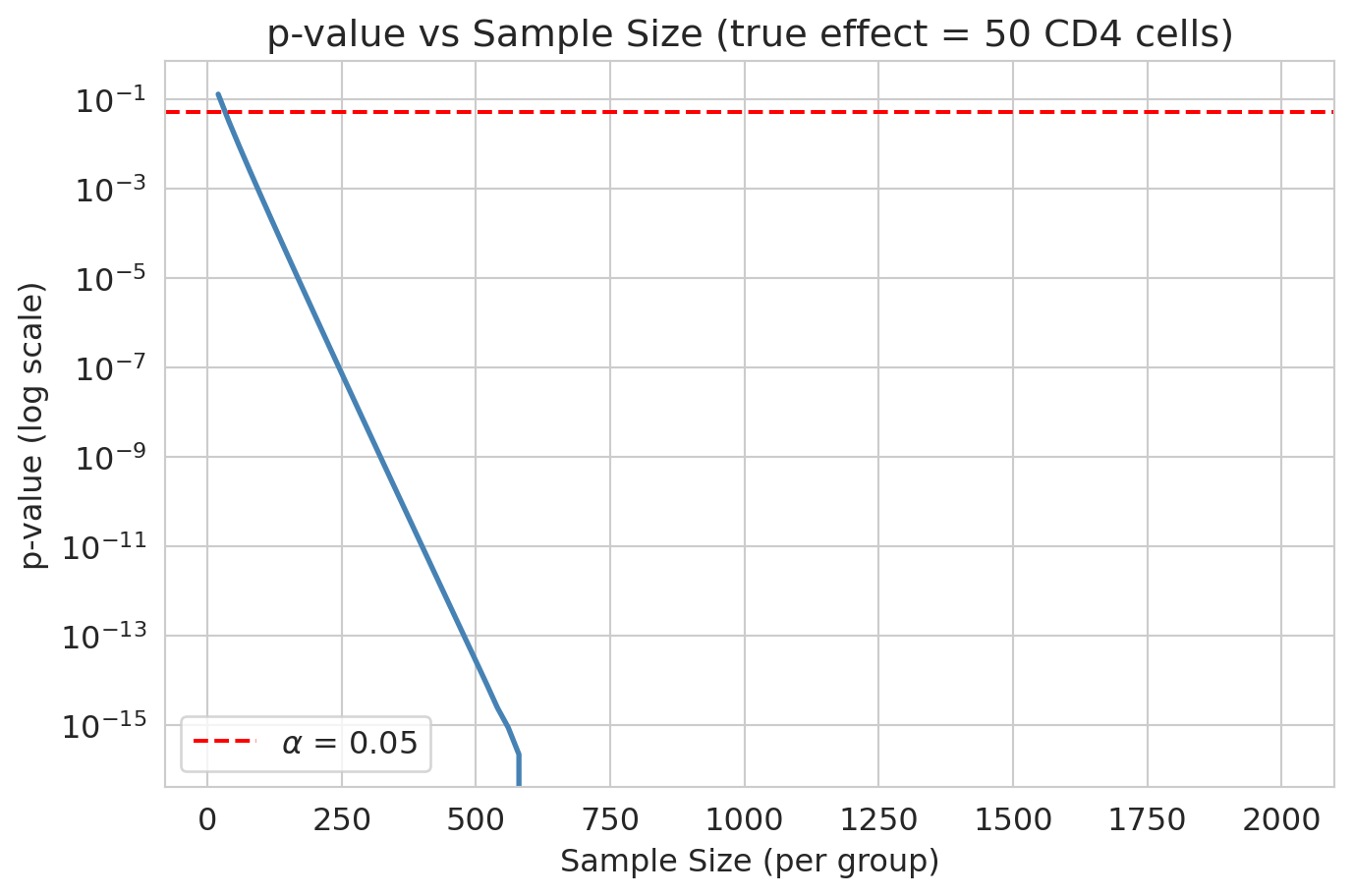 ax.set_title(f'p-value vs Sample Size (true effect = {observed_effect:.0f} CD4 cells)')