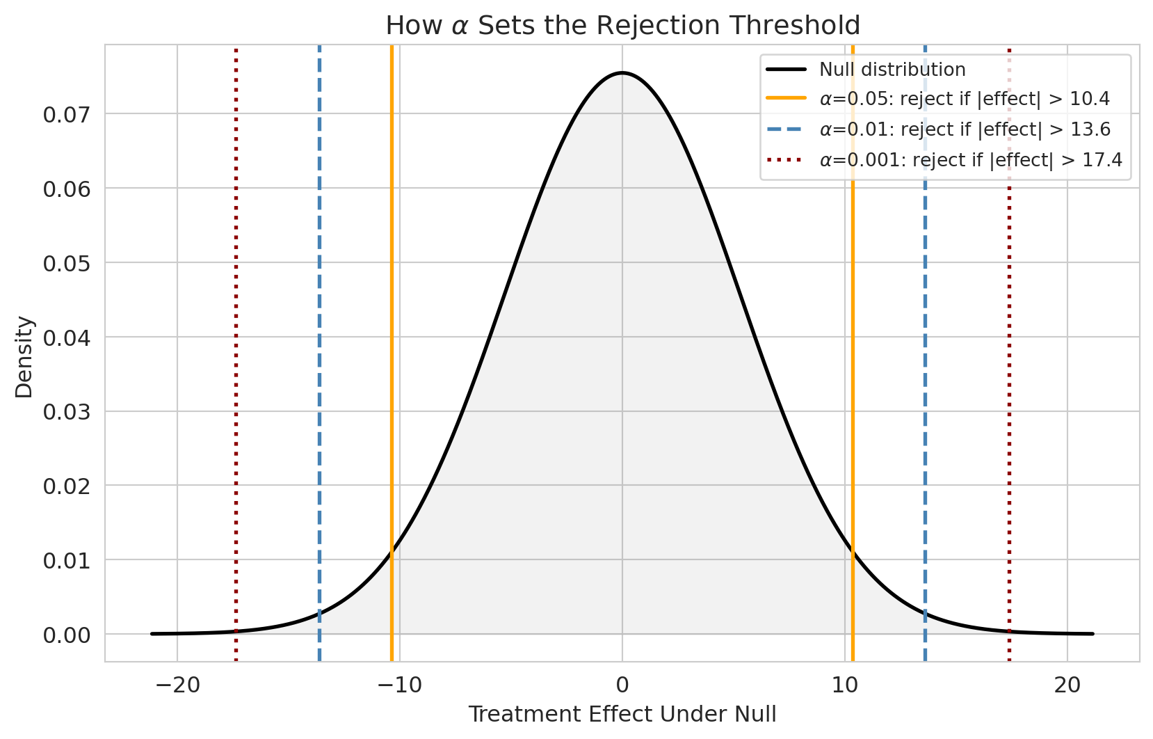 Convention: $\alpha = 0.05$. But why 0.05? R.A. Fisher suggested 0.05 in 1925 as a "convenient" threshold. It stuck, but there's nothing magical about it. Some fields use 0.01; particle physics uses roughly 0.0000003. We'll see in a moment why the choice should depend on the stakes.