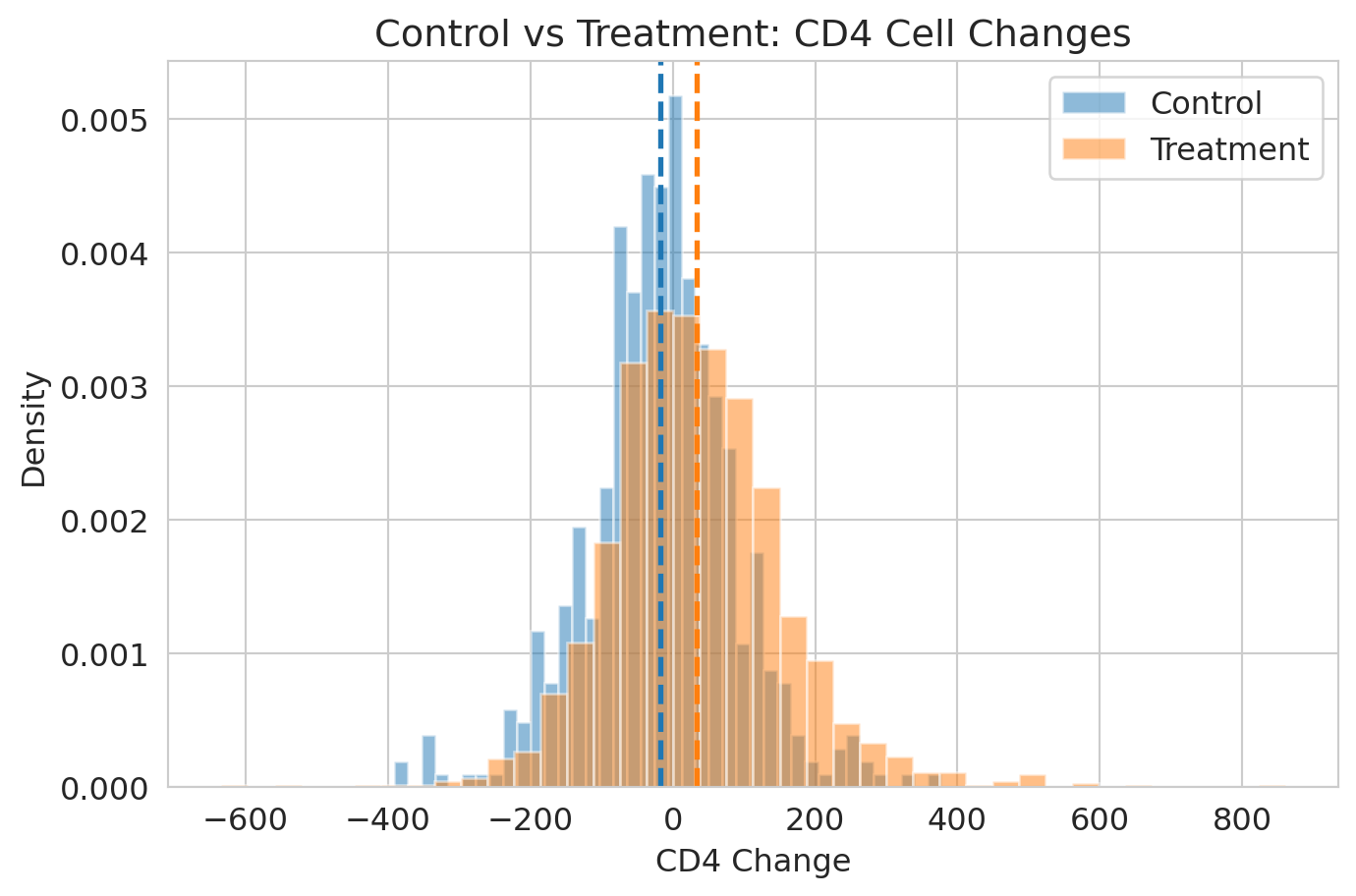 print(f"Observed treatment effect: {observed_effect:.1f} CD4 cells")