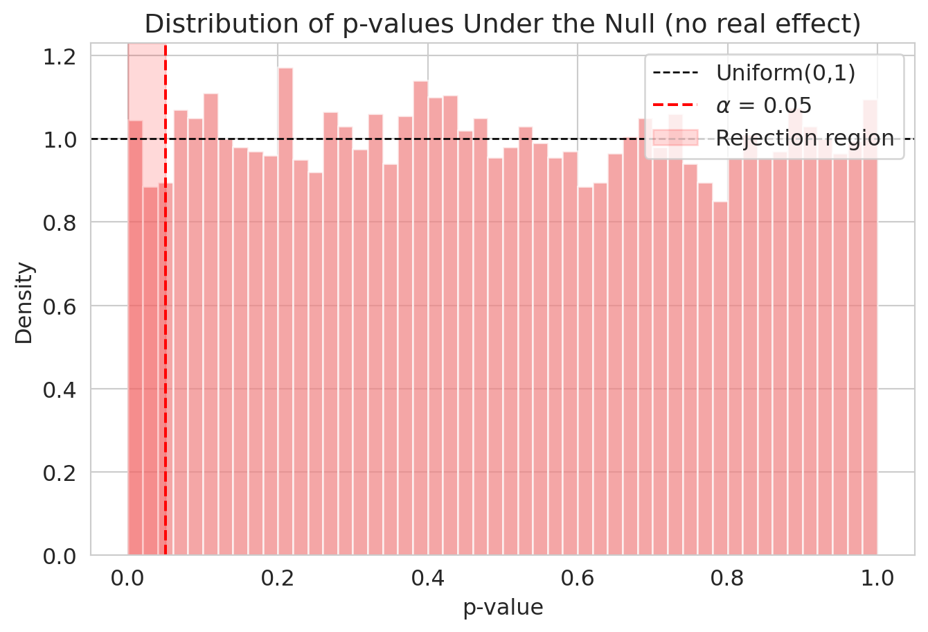 - **p-values are uniform under $H_0$**: Exact when the null fully specifies the distribution; a good approximation otherwise.