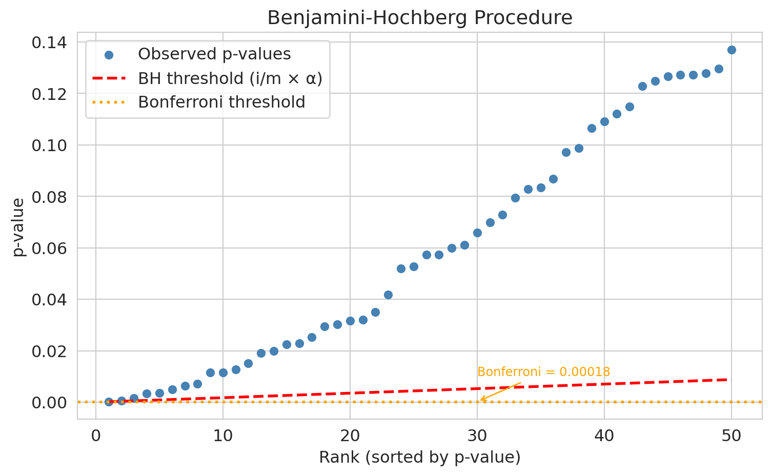 - Bonferroni is safe but conservative; BH is more powerful but allows a controlled fraction of false discoveries.