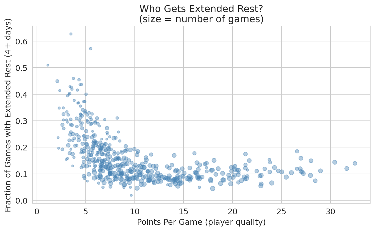 ax.set_title('Who Gets Extended Rest?\n(size = number of games)')