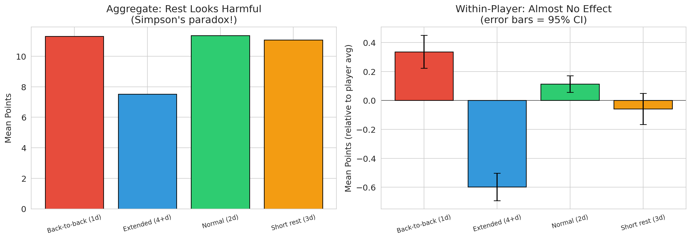 print(f"\nWithin-player, extended rest effect: {within_means.loc['Extended (4+d)']:+.3f} points")