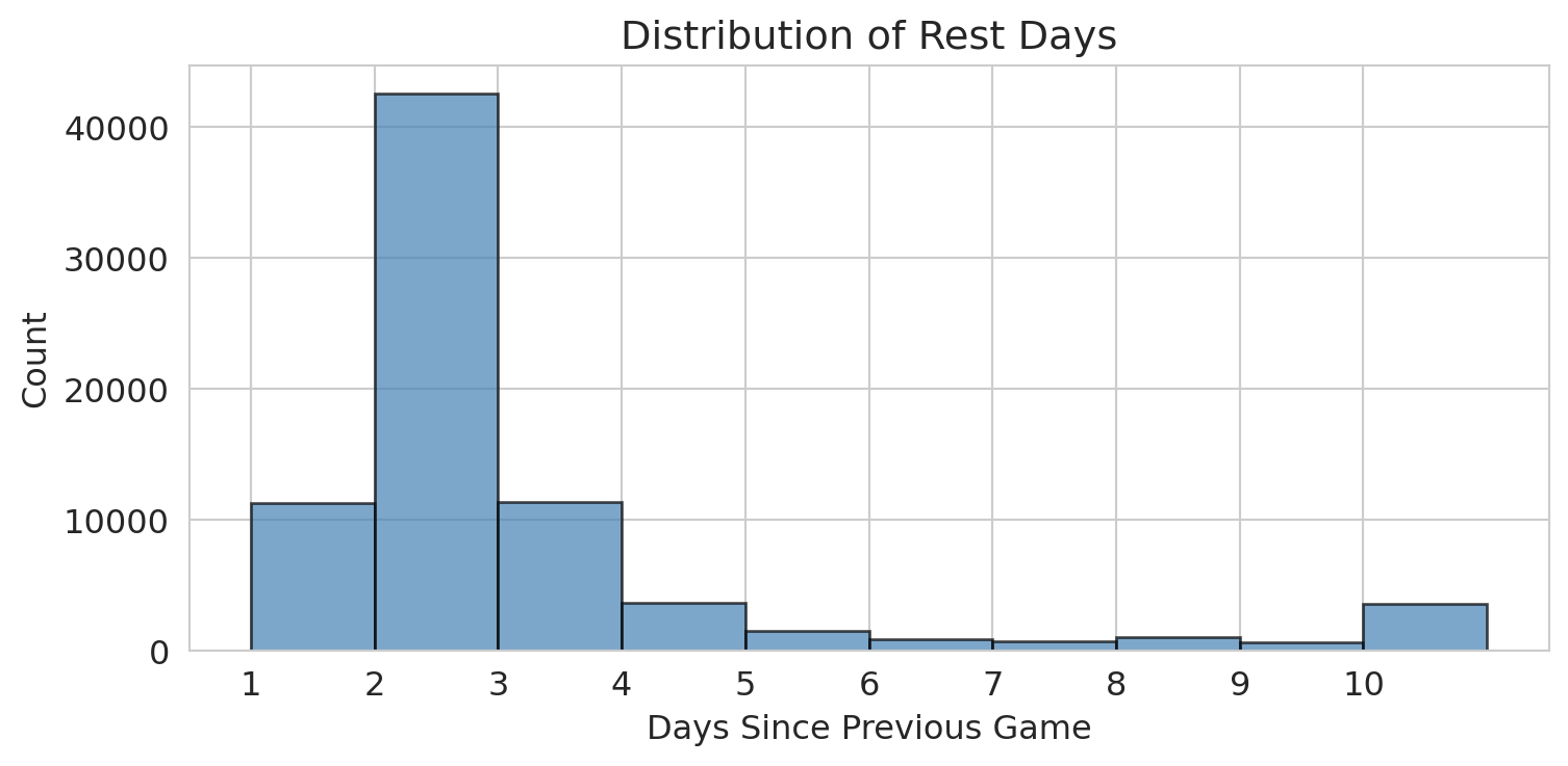 print(f"Games with rest info: {nba['REST_DAYS'].notna().sum():,}")