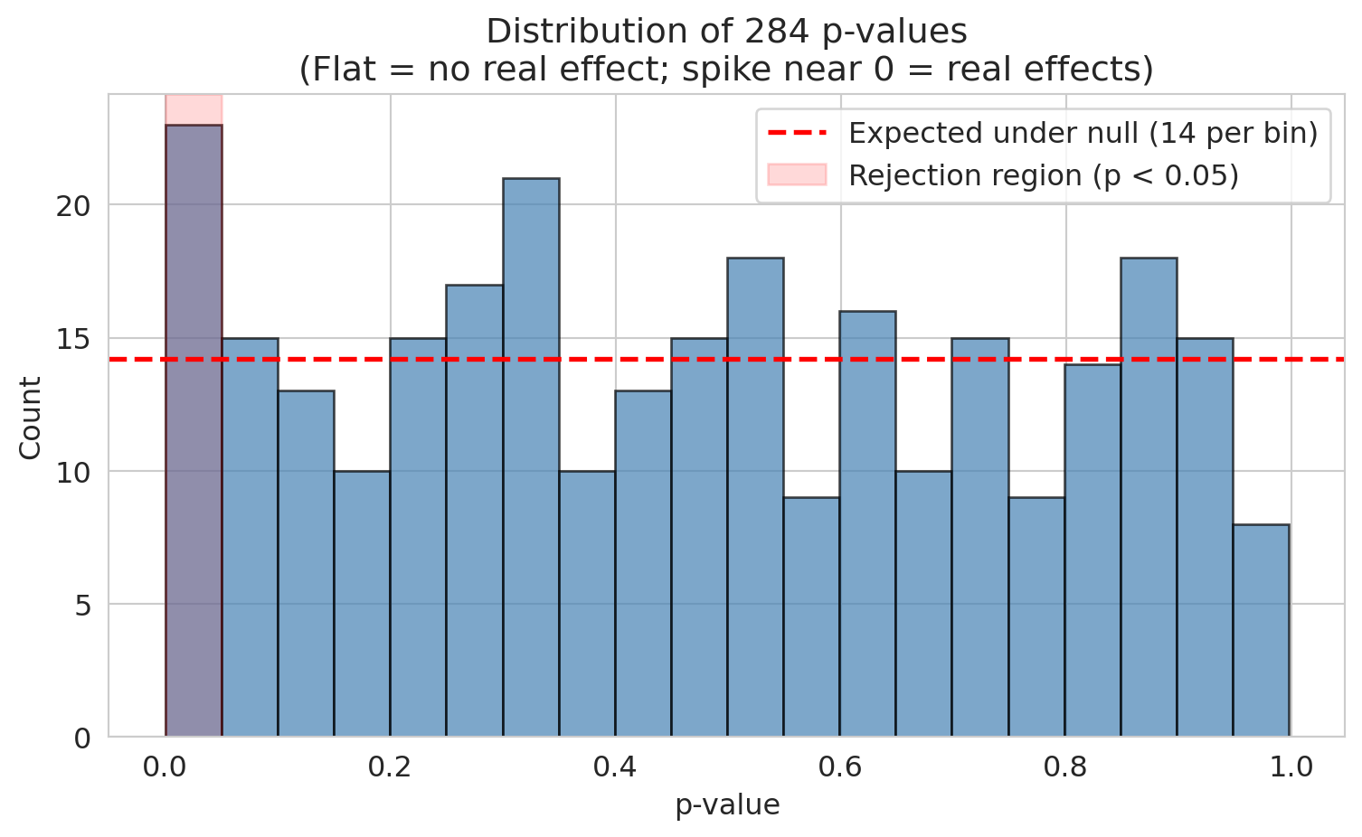 - A flat p-value histogram means no widespread effect; a spike near 0 means some discoveries are real.