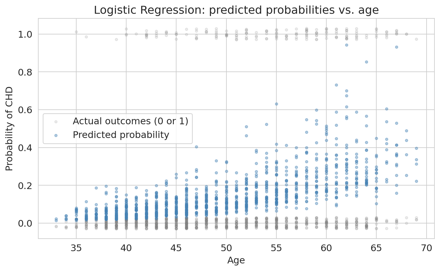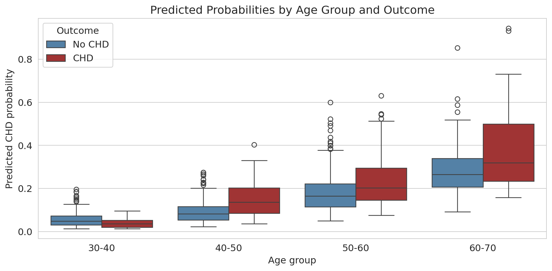 For older patients, the model separates CHD from non-CHD reasonably well (the distributions don't overlap as much). For younger patients, the predicted probabilities are all bunched near zero — the model thinks *nobody* young is at risk.