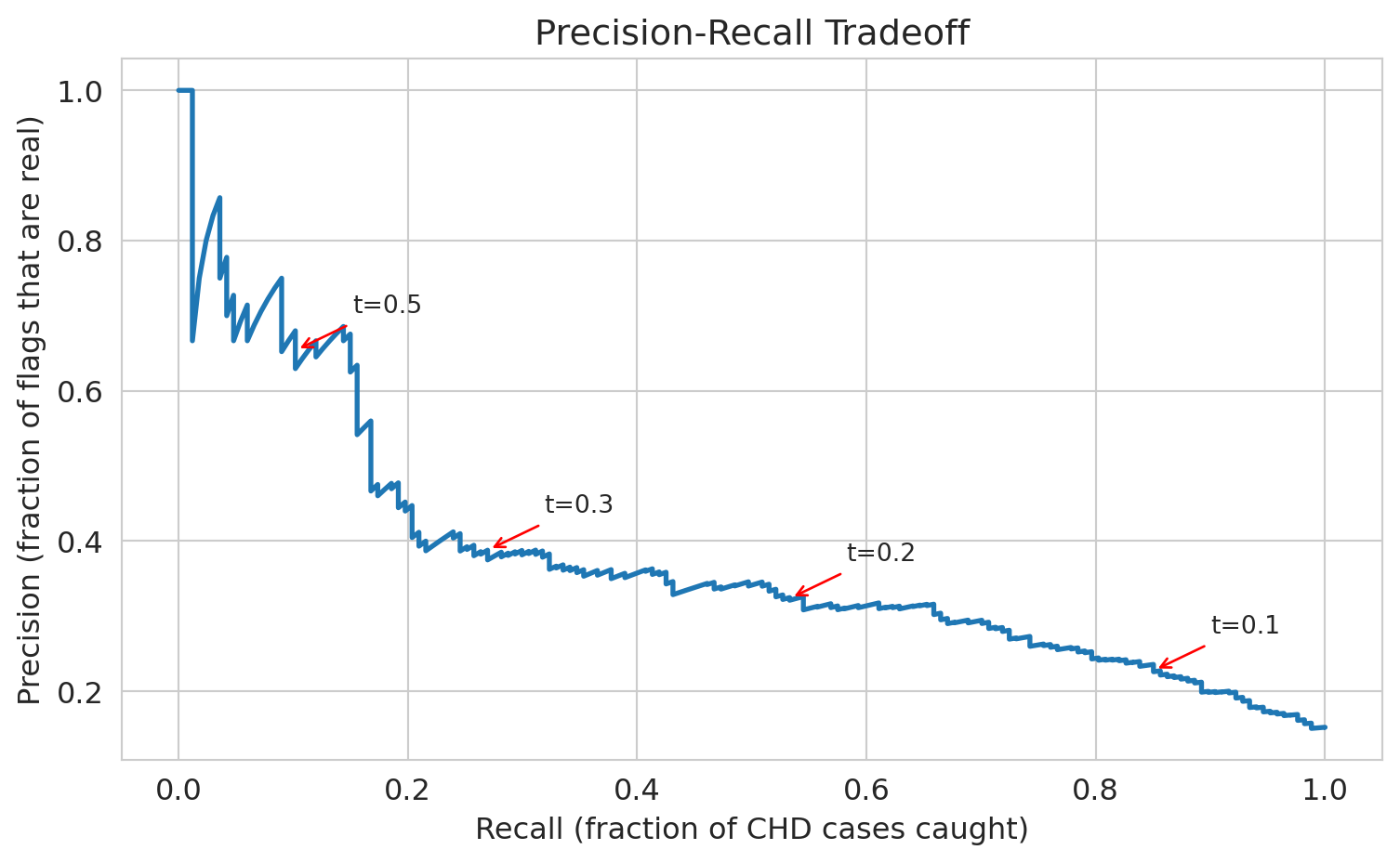 The hospital has to decide: **where on the precision-recall curve do we want to operate?** There's no purely statistical answer — it depends on intervention costs, staff availability, and patient outcomes.