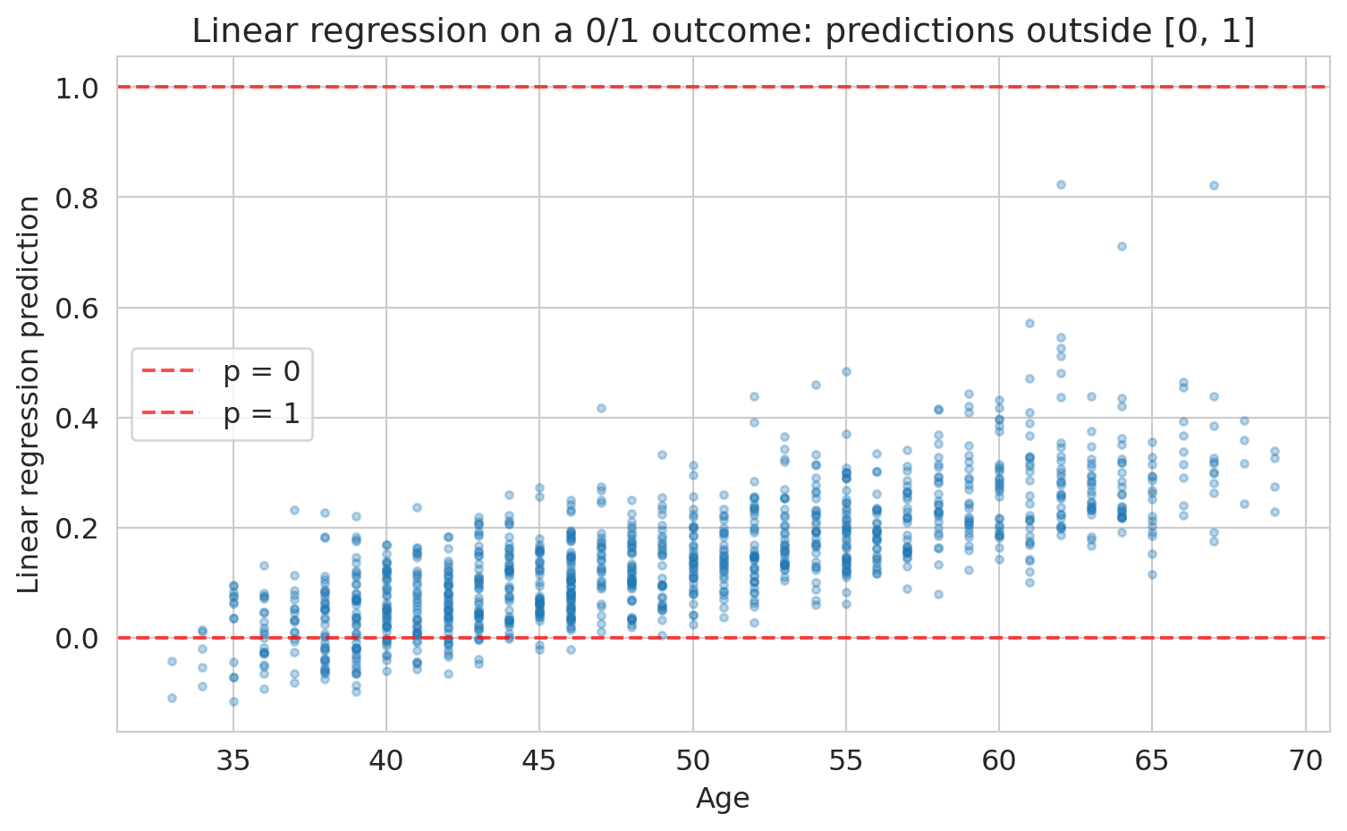 ax.set_title('Linear regression on a 0/1 outcome: predictions outside [0, 1]')