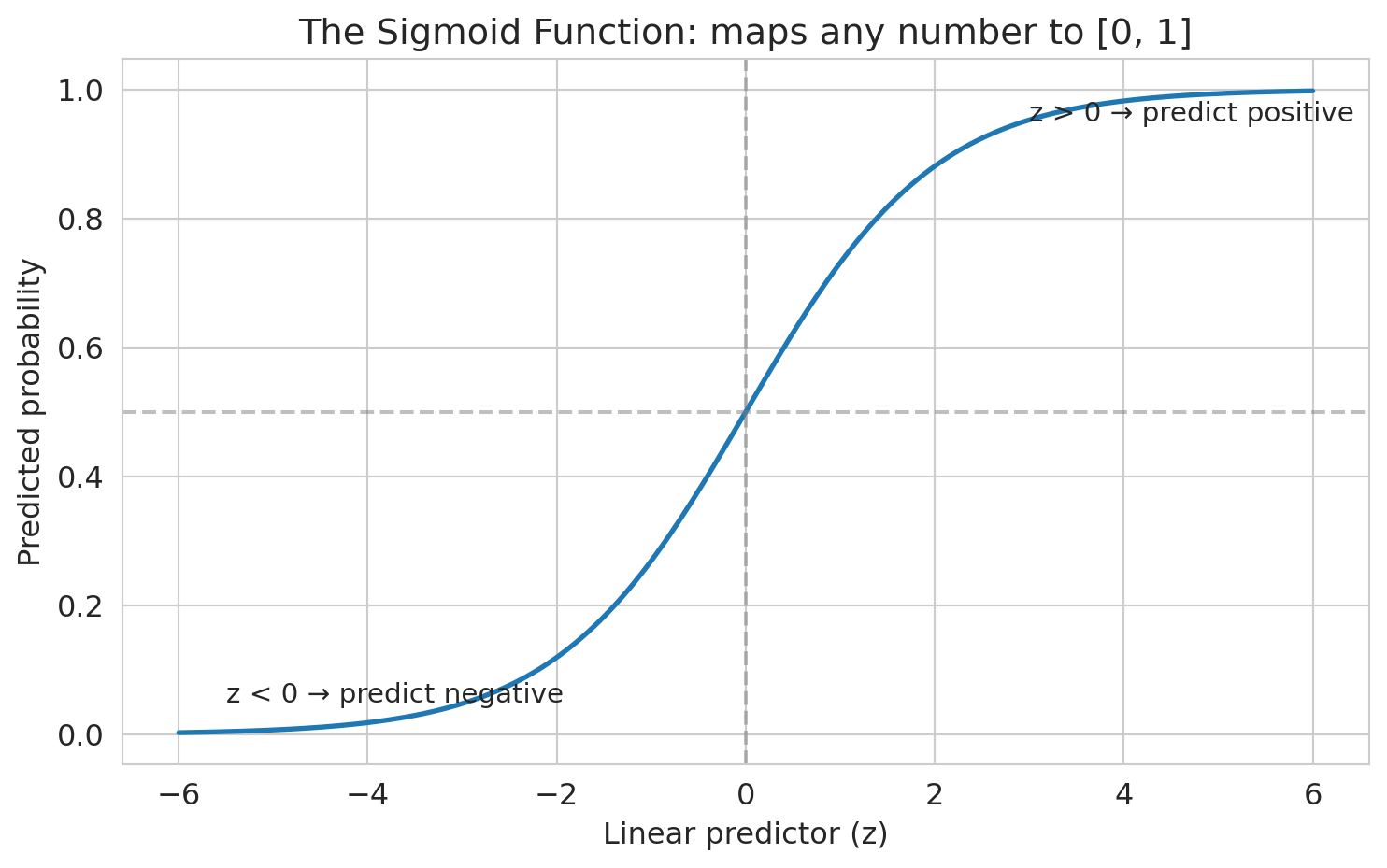Some predictions are negative, some are above 1. Those don't make sense as probabilities. We need a function that squashes any number into [0, 1]. The **sigmoid function** does exactly this.