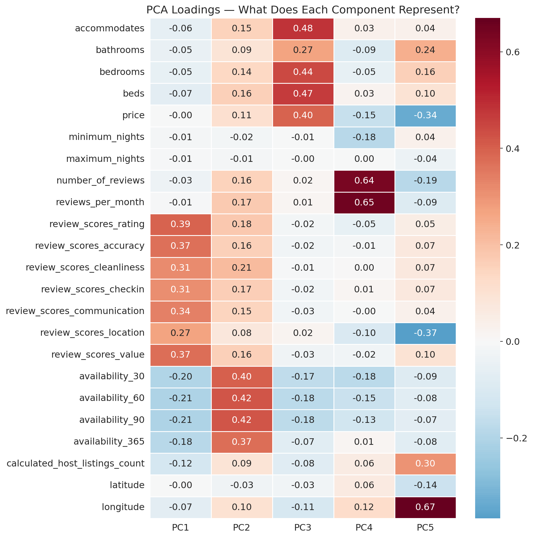 PCA on unstandardized data just picks up whichever column has the biggest numbers. PC1 is basically "maximum_nights" — that's not a useful summary of anything.