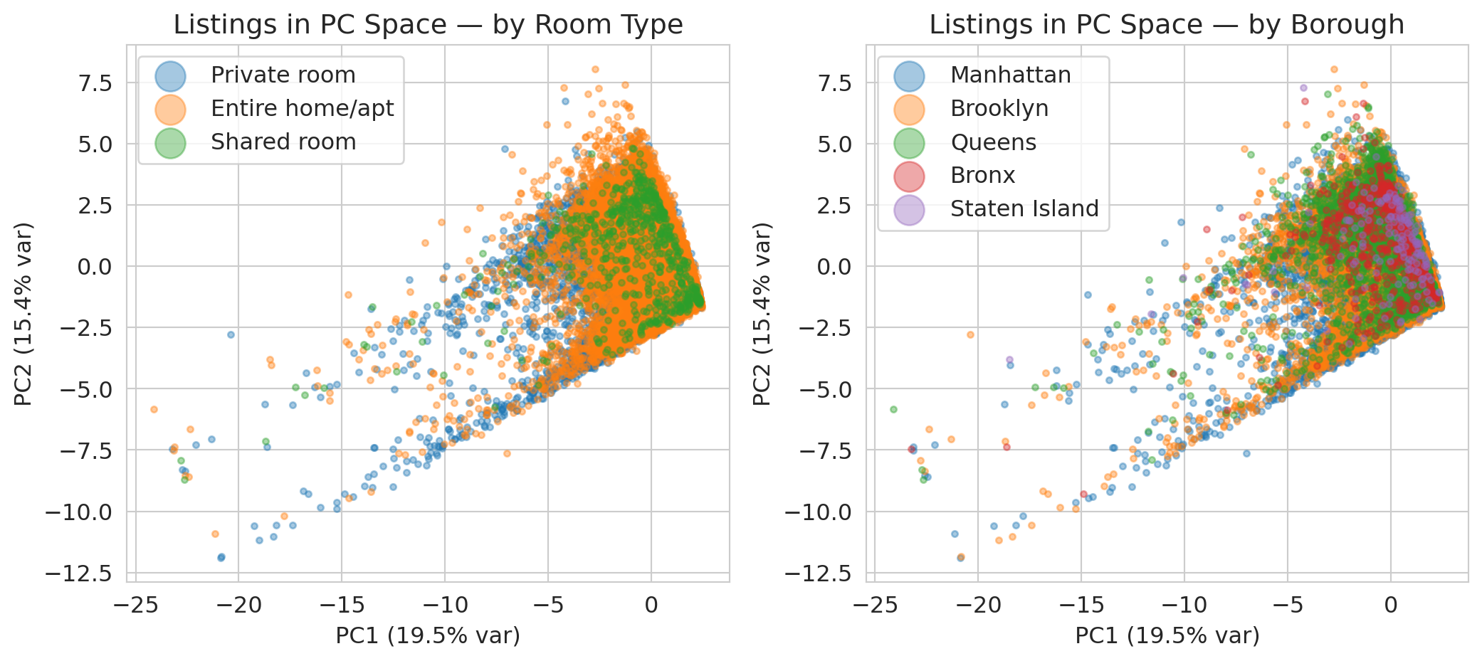 Boroughs show less separation in these first two PCs. Geography isn't the dominant source of variance in the standardized data — review patterns and availability matter more.