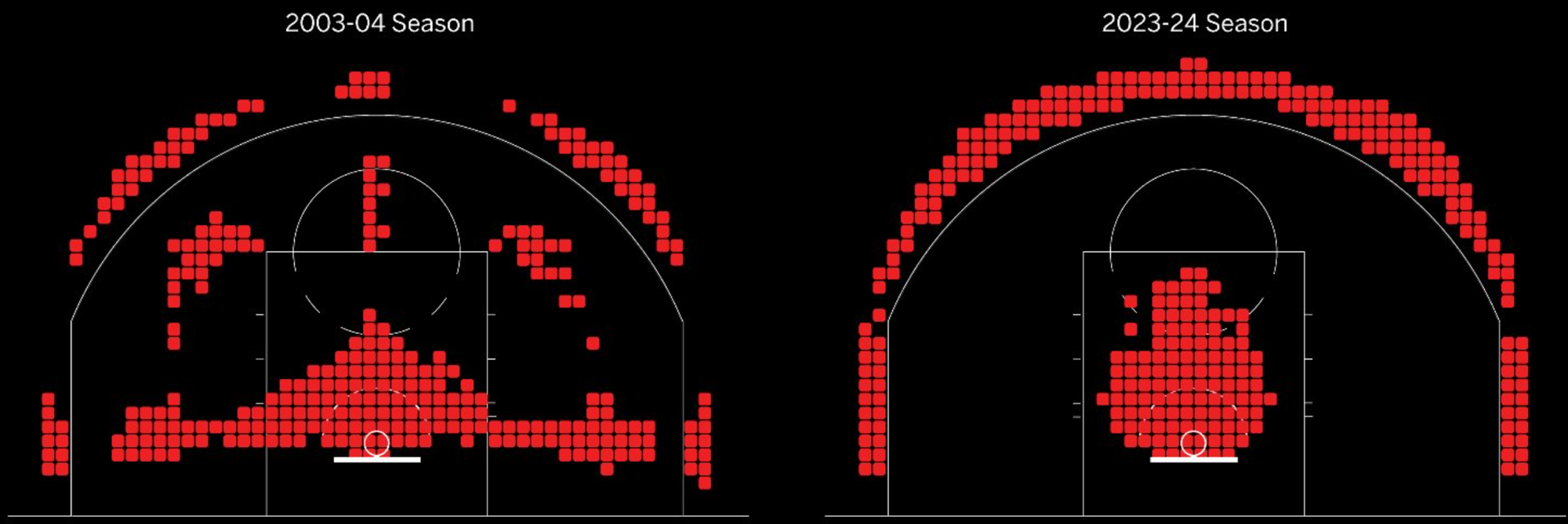 NBA shot locations, 2003 vs 2024. why did players eliminate the mid-range jumper?
